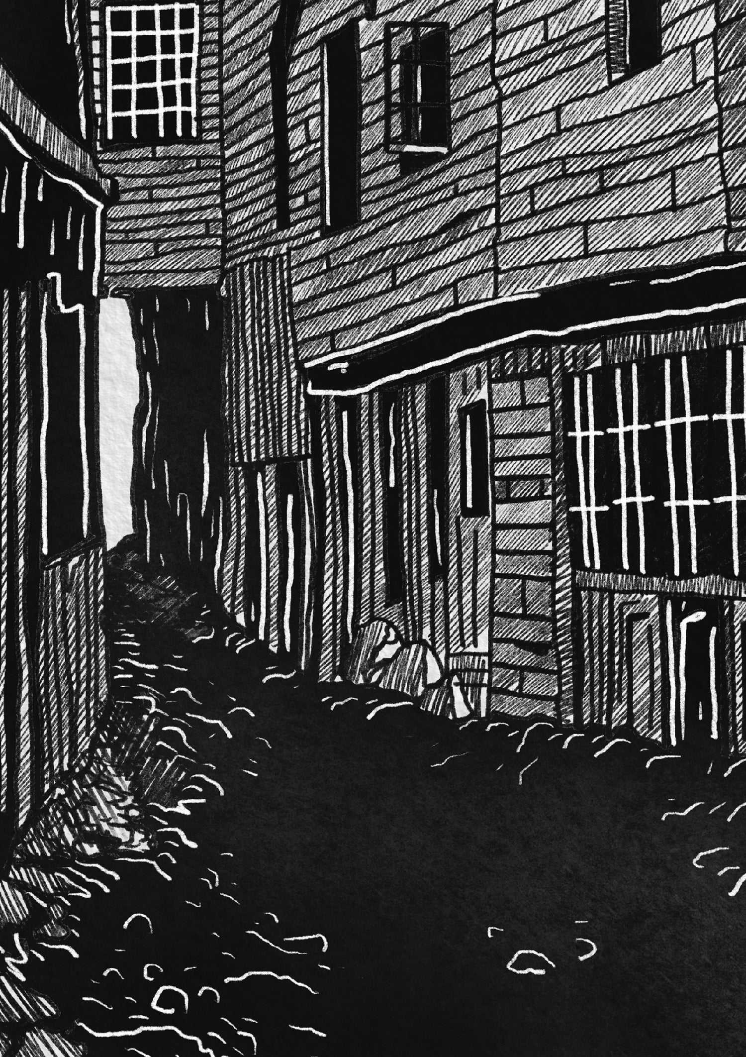 This drawing shows an old ancient inn on Borough High Street with the Shard in the background